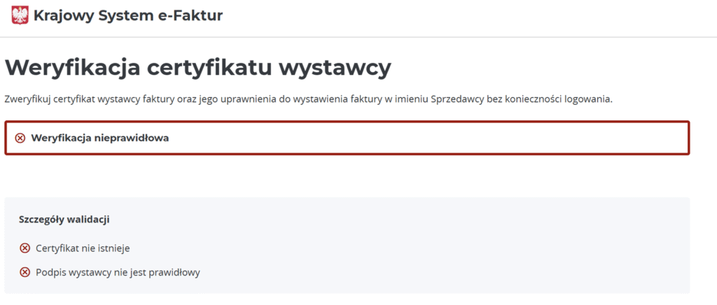 Jeżeli natomiast weryfikacja będzie nieprawidłowa, to zobaczy taki widok: